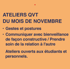 En ce mois de novembre 2023, la Qualité de Vie au Travail (QVT) vous propose de participer à de nouveaux ateliers.