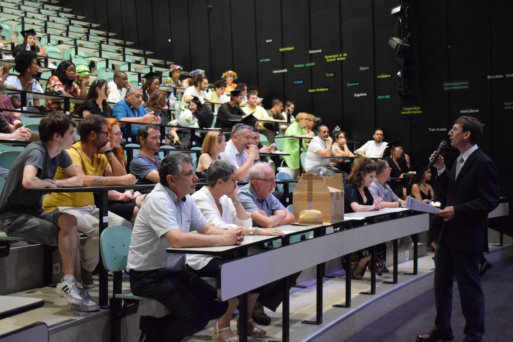 A cette occasion, le Président de l’Université, monsieur Pierre-Alain Muller, le directeur de la formation LEA, monsieur Laurent Berec et les responsables de licence 1, monsieur Philippe Brengard, et licence 3, madame Adèle Muller, ainsi que les enseignants de la formation, madame Paola Fossa et monsieur Muauia Alabdulmagid, ont félicité les étudiant.e.s présent.e.s à la cérémonie du parcours EI (Économie et Interculturalité) et du parcours TST (Traductions Scientifiques et Techniques) pour leur réussite et leur parcours universitaire.