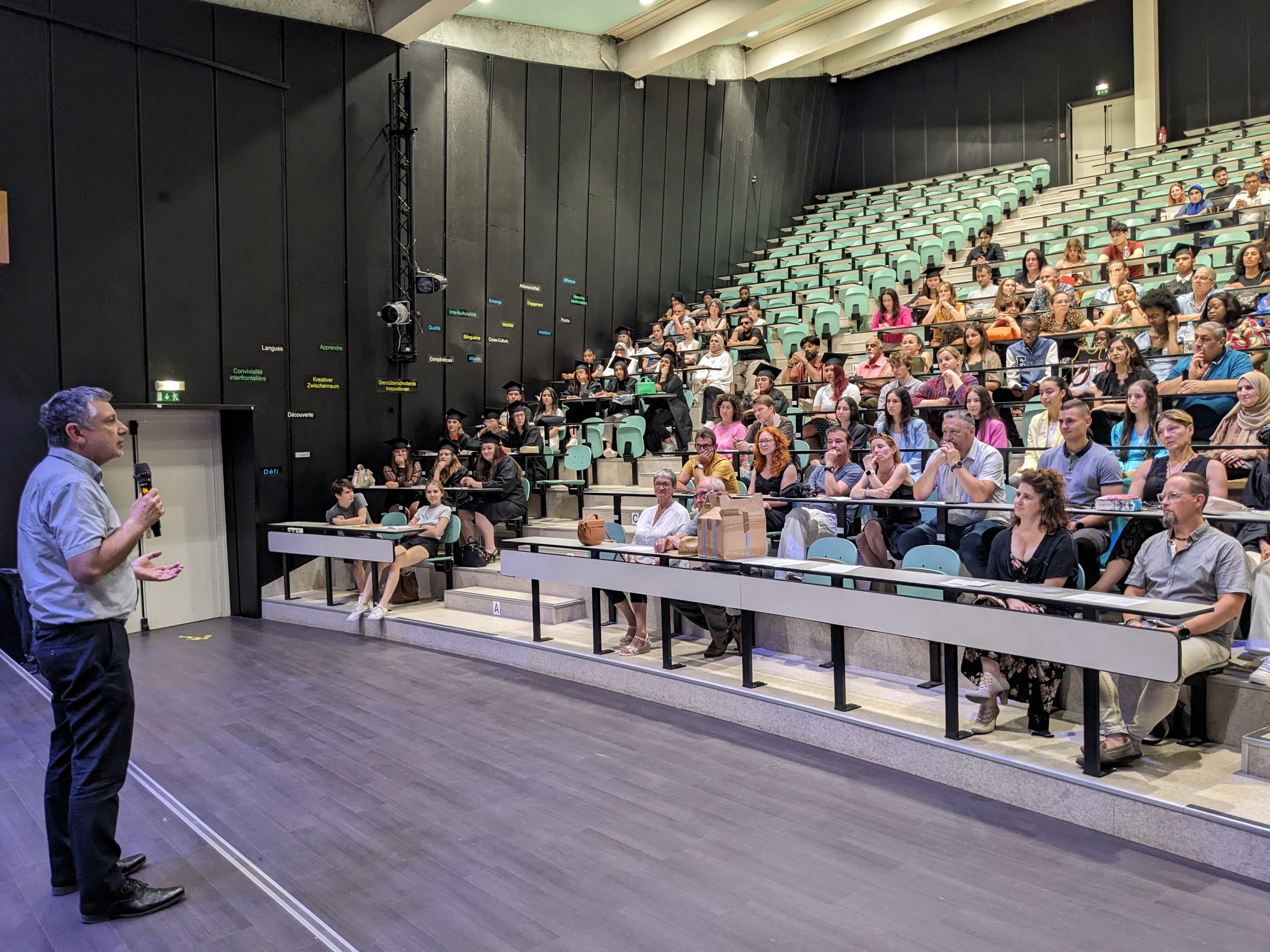 A cette occasion, le Président de l’Université, monsieur Pierre-Alain Muller, le directeur de la formation LEA, monsieur Laurent Berec et les responsables de licence 1, monsieur Philippe Brengard, et licence 3, madame Adèle Muller, ainsi que les enseignants de la formation, madame Paola Fossa et monsieur Muauia Alabdulmagid, ont félicité les étudiant.e.s présent.e.s à la cérémonie du parcours EI (Économie et Interculturalité) et du parcours TST (Traductions Scientifiques et Techniques) pour leur réussite et leur parcours universitaire.