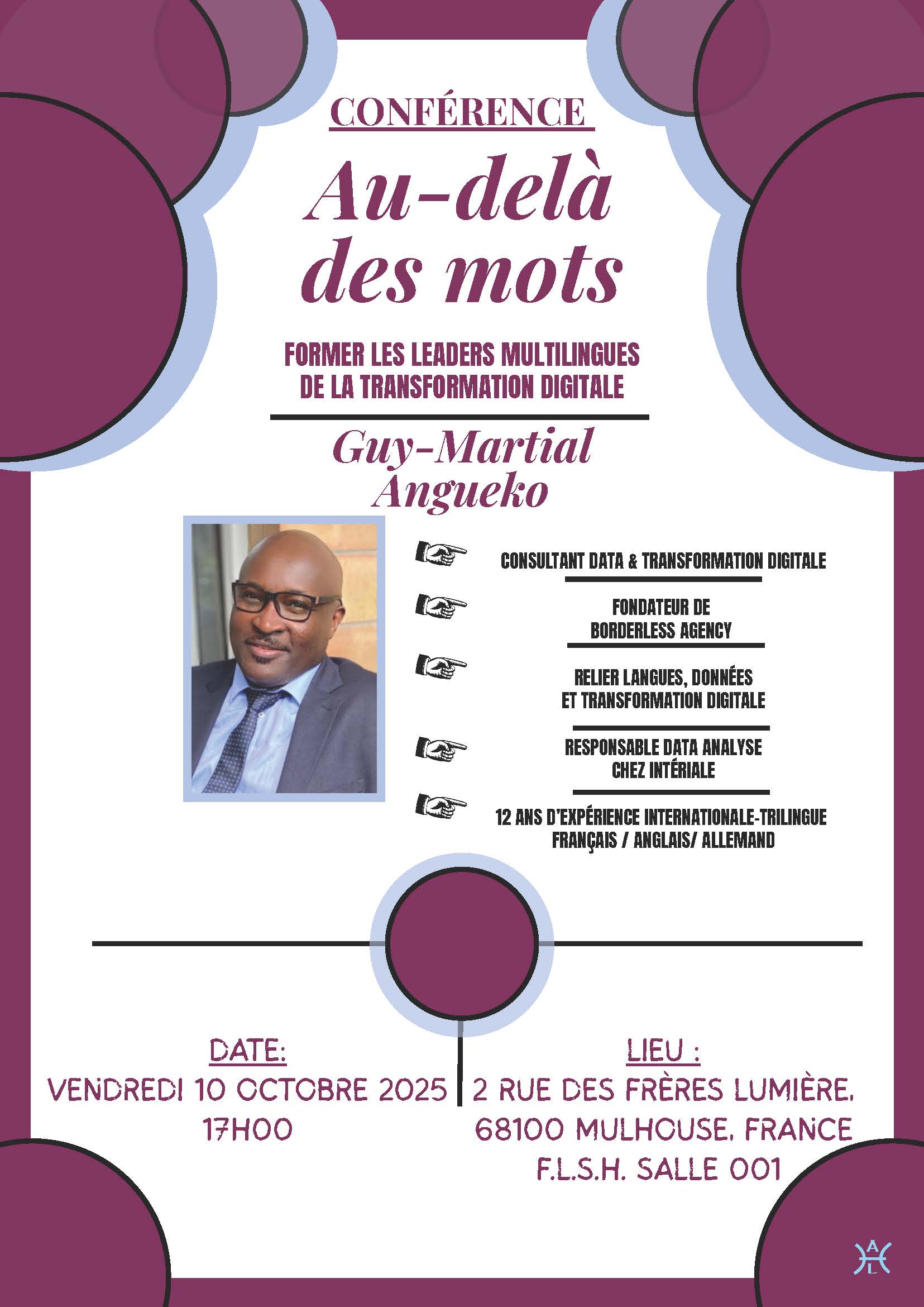 Le vendredi 10 octobre à 17 heures dans la salle 001 à la FLSH, Monsieur Guy-Martial Angueko, chef d’entreprise, fera une conférence intitulée Au-delà des mots : former les leaders multilingues de la transformation digitale.