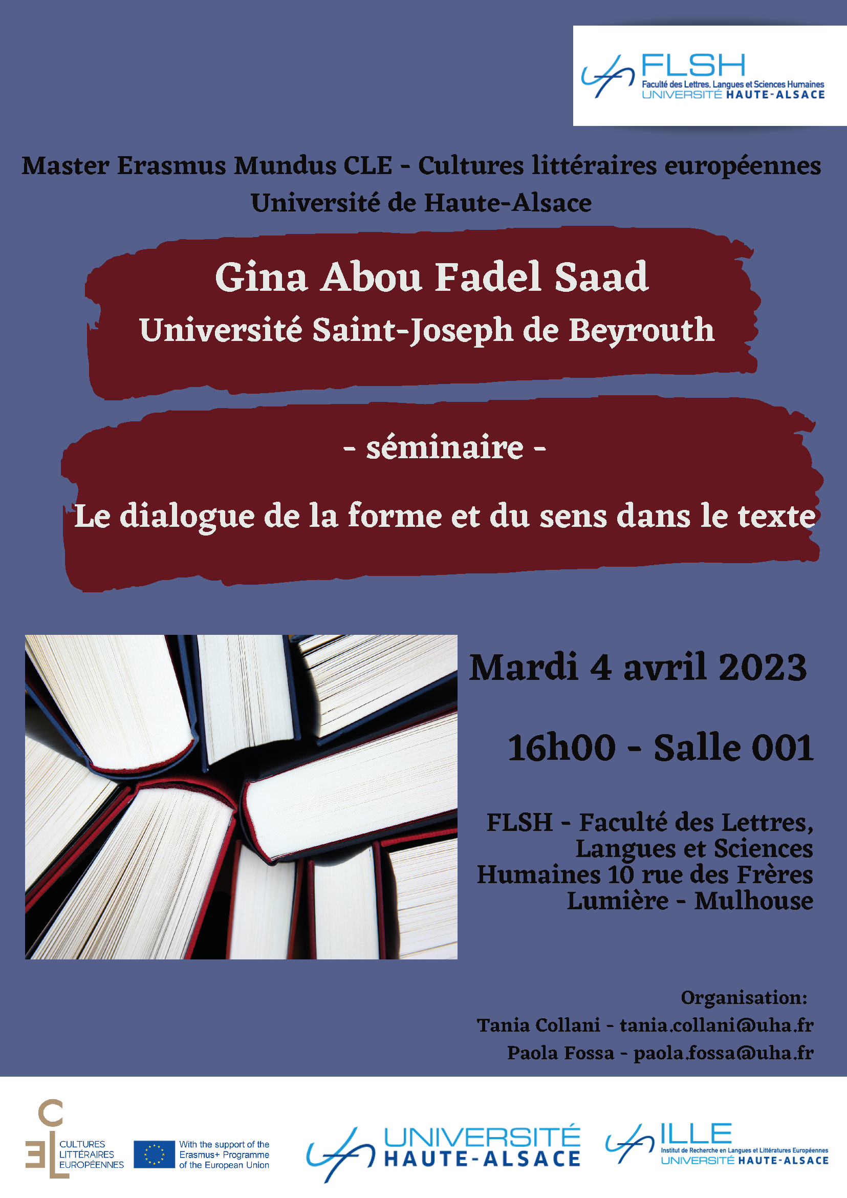 Gina Abou Fadel Saad, « Le dialogue de la forme et du sens dans le texte » + Ajouter à mon Agenda Google + iCal / Outlook export Date 04 Avr 2023 Expired! Heure 16 h 00 min - 18 h 00 min Heure Locale Fuseau Horaire : America/New_York Date : 04 Avr 2023 Heure : 10 h 00 min - 12 h 00 min Lieu FLSH - salle 001 10, rue des Frères Lumière 68093 Mulhouse cedex Catégorie Rencontre Partagez cet événement