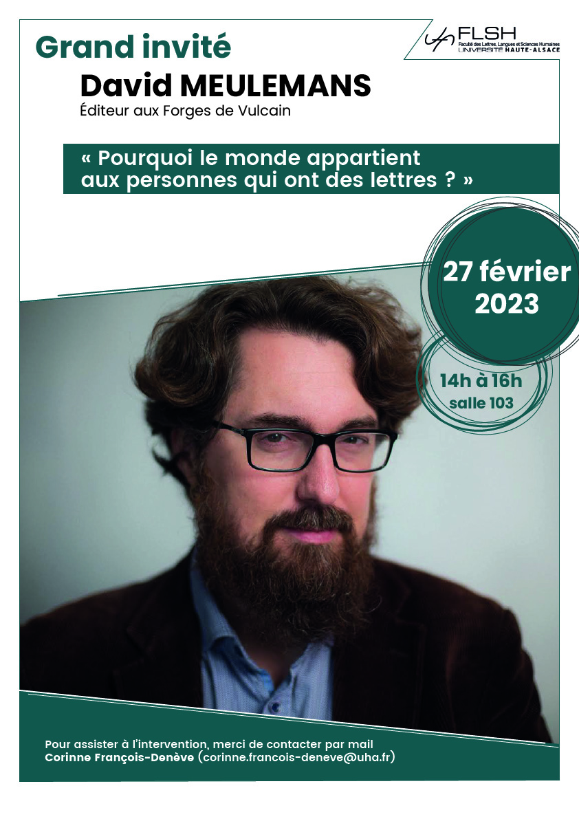 L’éditeur David Meulemans (éditions Aux forges de Vulcain) viendra parler de son travail mais aussi et surtout de l’édition, de ce commerce des idées et des textes qui contribue à la conversation collective, et aussi de toute cette industrie culturelle faite de lectrices, lecteurs, libraires, bibliothécaires, autrices, auteurs qui sont autant de métiers où les gens de lettres règnent en maîtres !