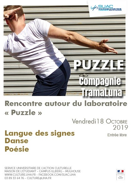 Le samedi 19 et le dimanche 20 octobre 2019, soyez nombreux à venir participer au projet créatif « PUZZLE » sur la traduction (langue de signes, danse et langues française et anglaise) présenté par la compagnie de danse contemporaine lyonnaise TramaLuna à l’Université de Haute-Alsace. Des chercheurs en littérature, danse, langue des signes et linguistiques viendront animer ces deux journées d’échange.