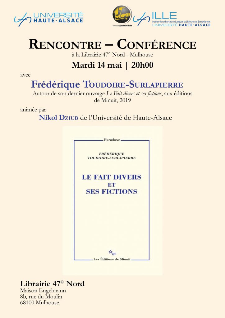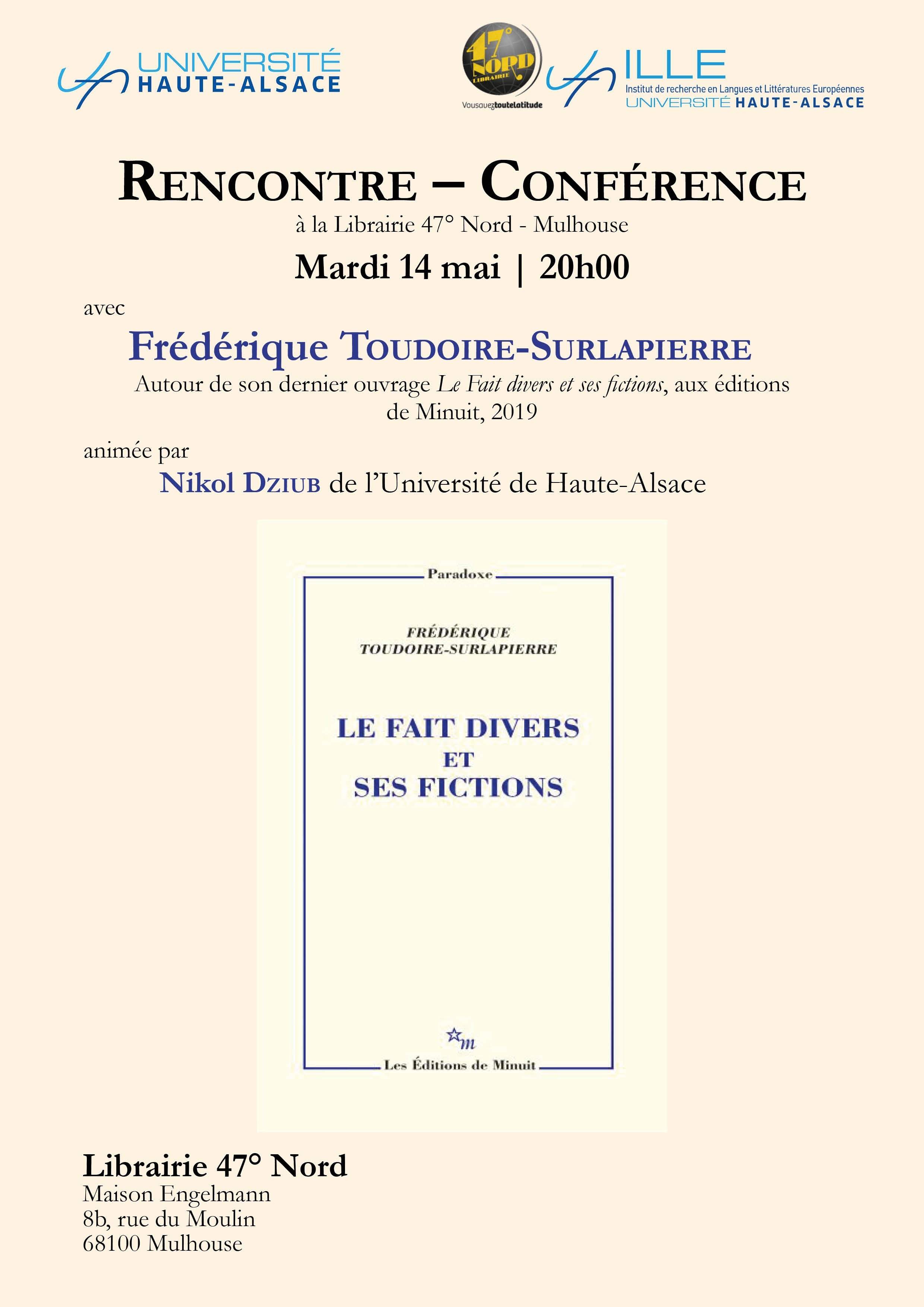 Conférence avec Frédérique Toudoire-Surlapierre autour de son dernier ouvrage Le Fait divers et ses fictions, aux éditions de Minuit, 2019.