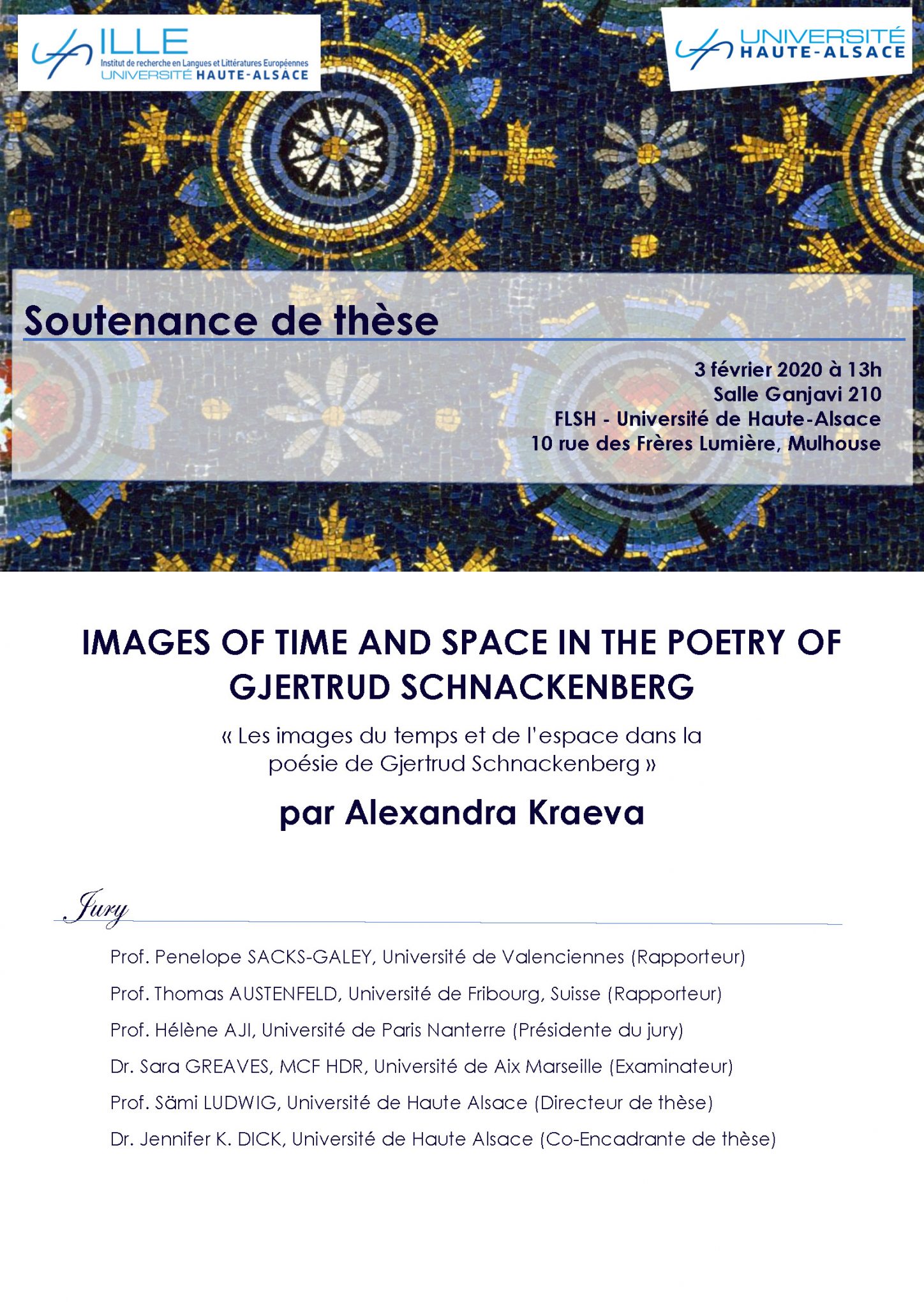 Soutenance de Alexandra Kreava + Ajouter à mon Agenda Google + iCal / Outlook export Date 03 Fév 2020 Expired! Heure 13 h 00 min Heure Locale Fuseau Horaire : America/New_York Date : 03 Fév 2020 Heure : 7 h 00 min Lieu FLSH - Salle Gandjavi 10, Rue des Frères Lumière 68093 MULHOUSE Partagez cet événement